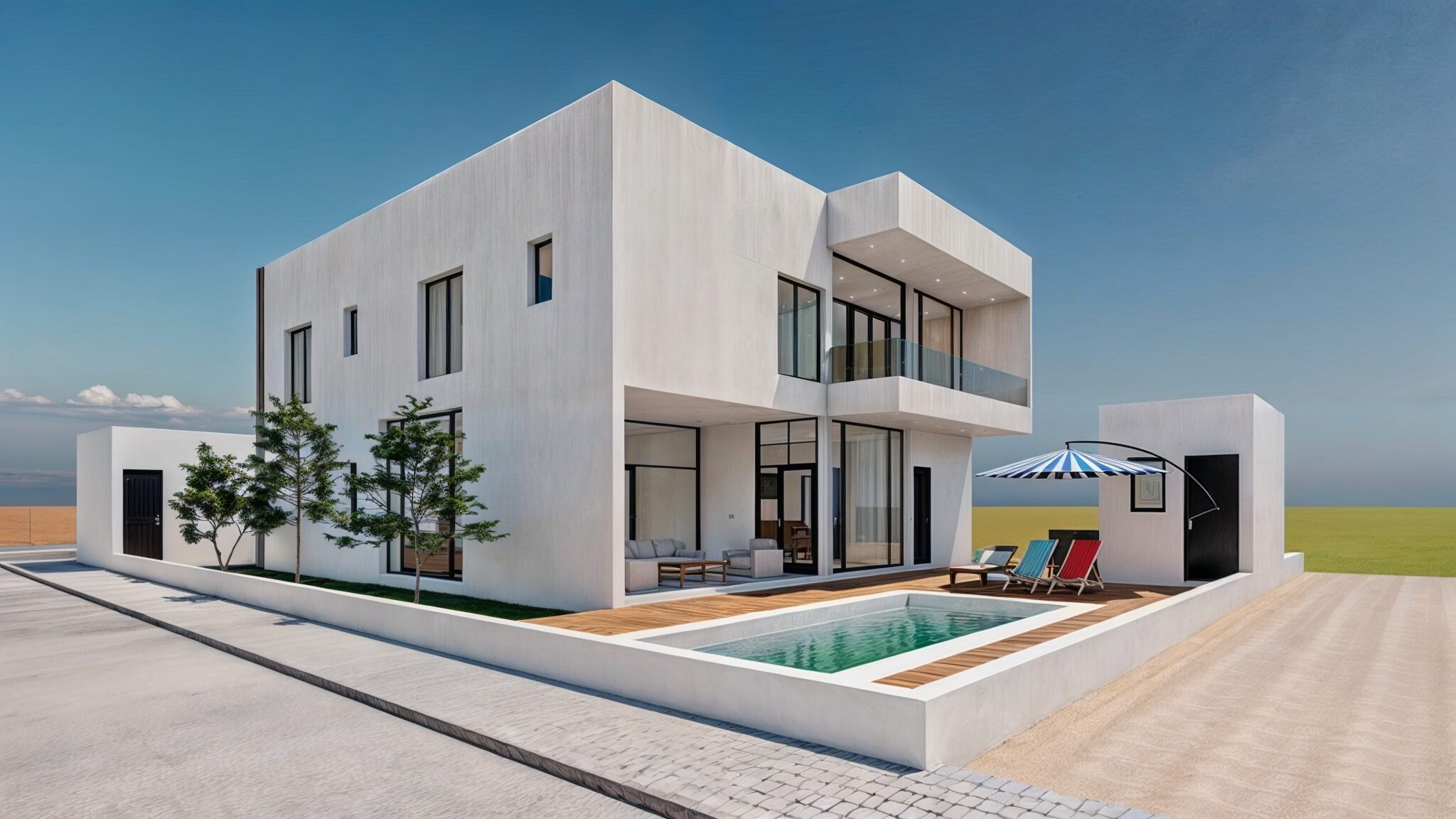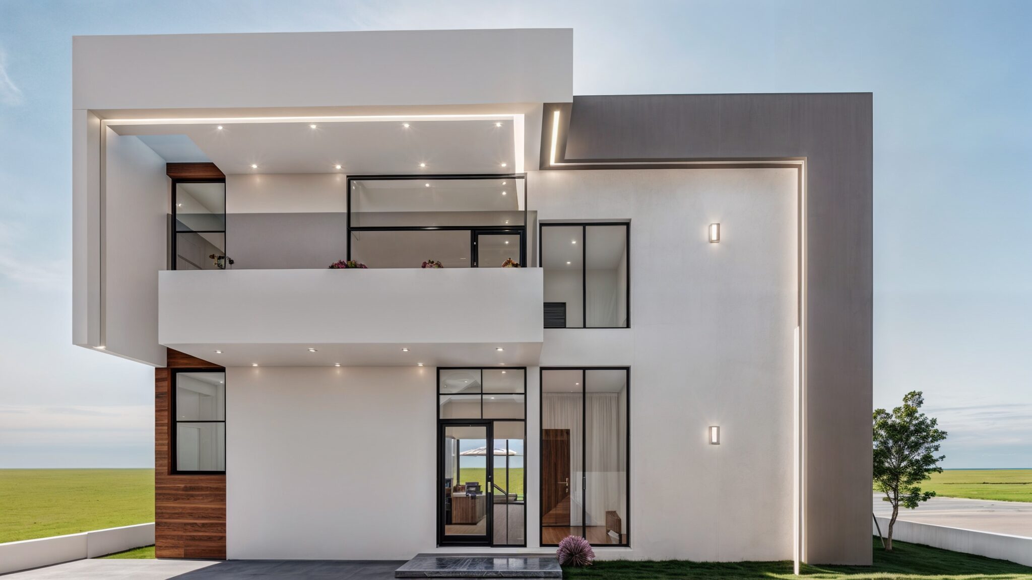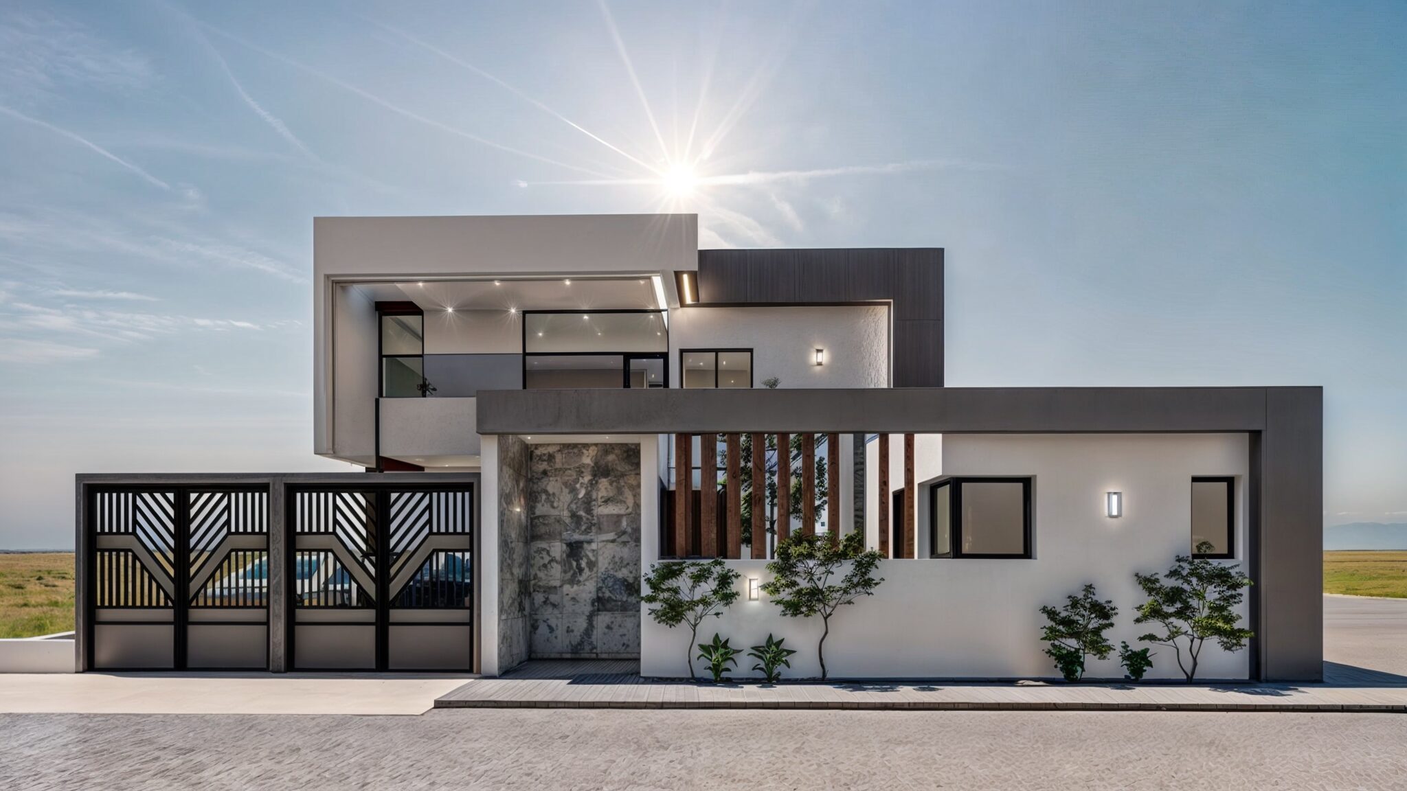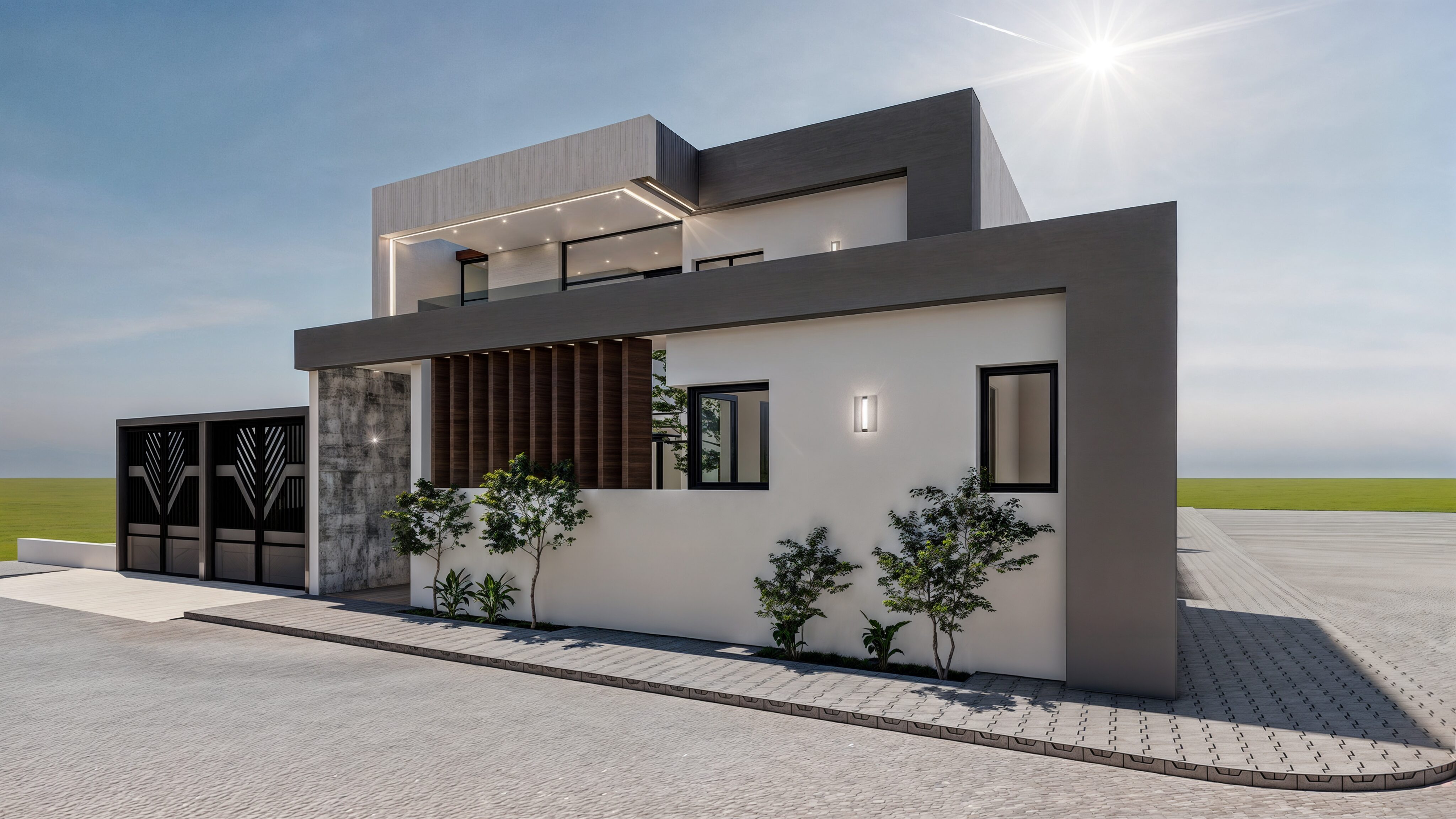 La Villa Duplex AL se distingue par une façade moderne aux lignes nettes, mêlant béton brut, enduits clairs et éléments verticaux décoratifs. L’ensemble crée une identité architecturale forte, sobre et intemporelle.