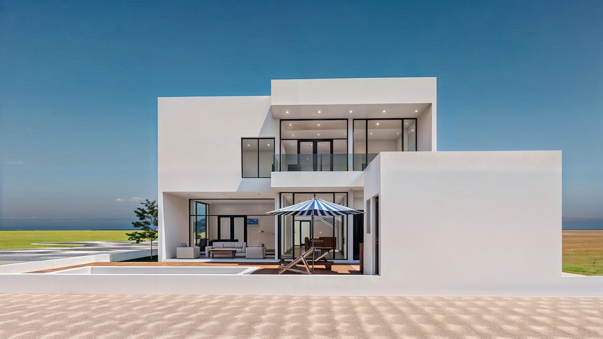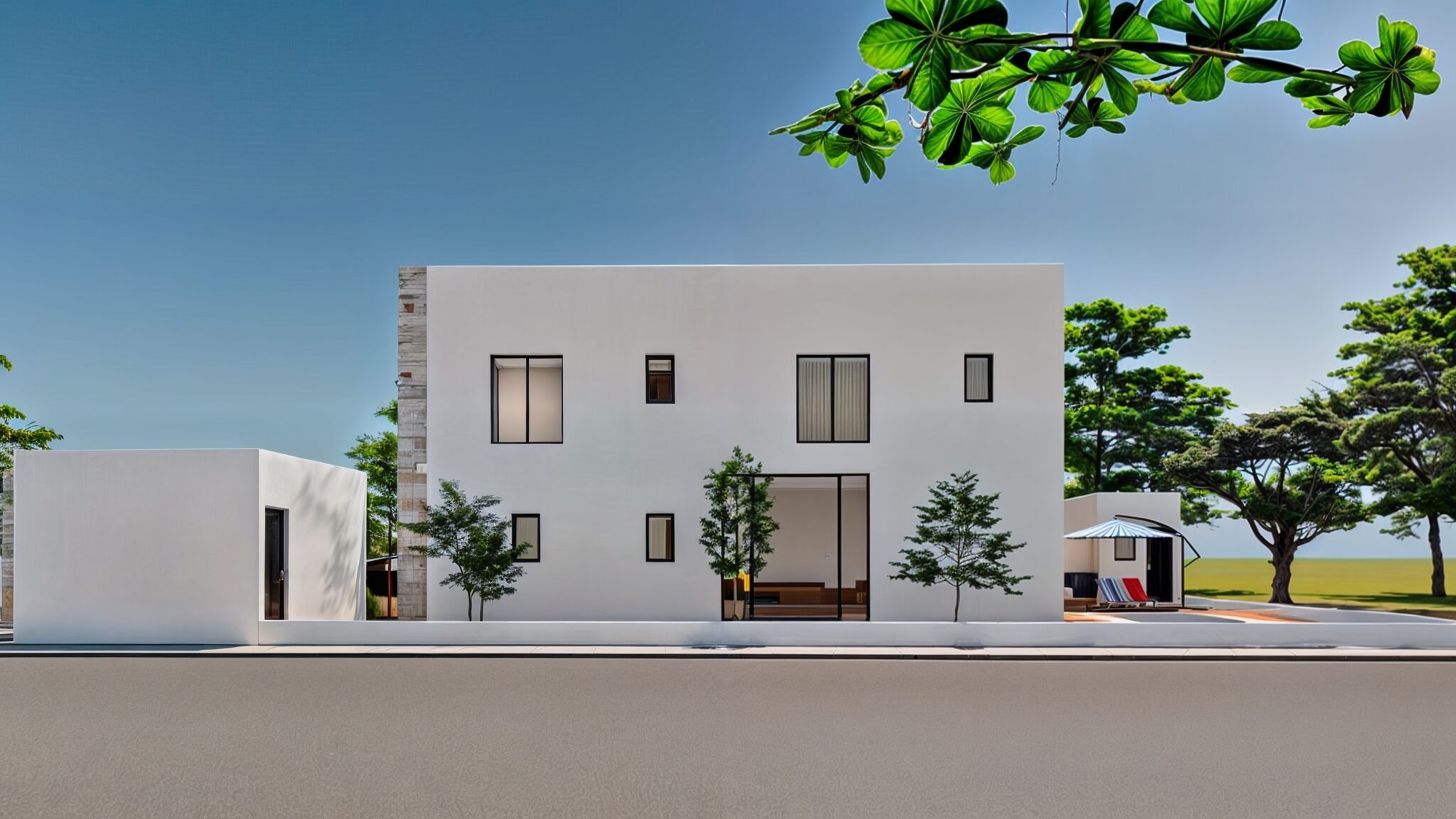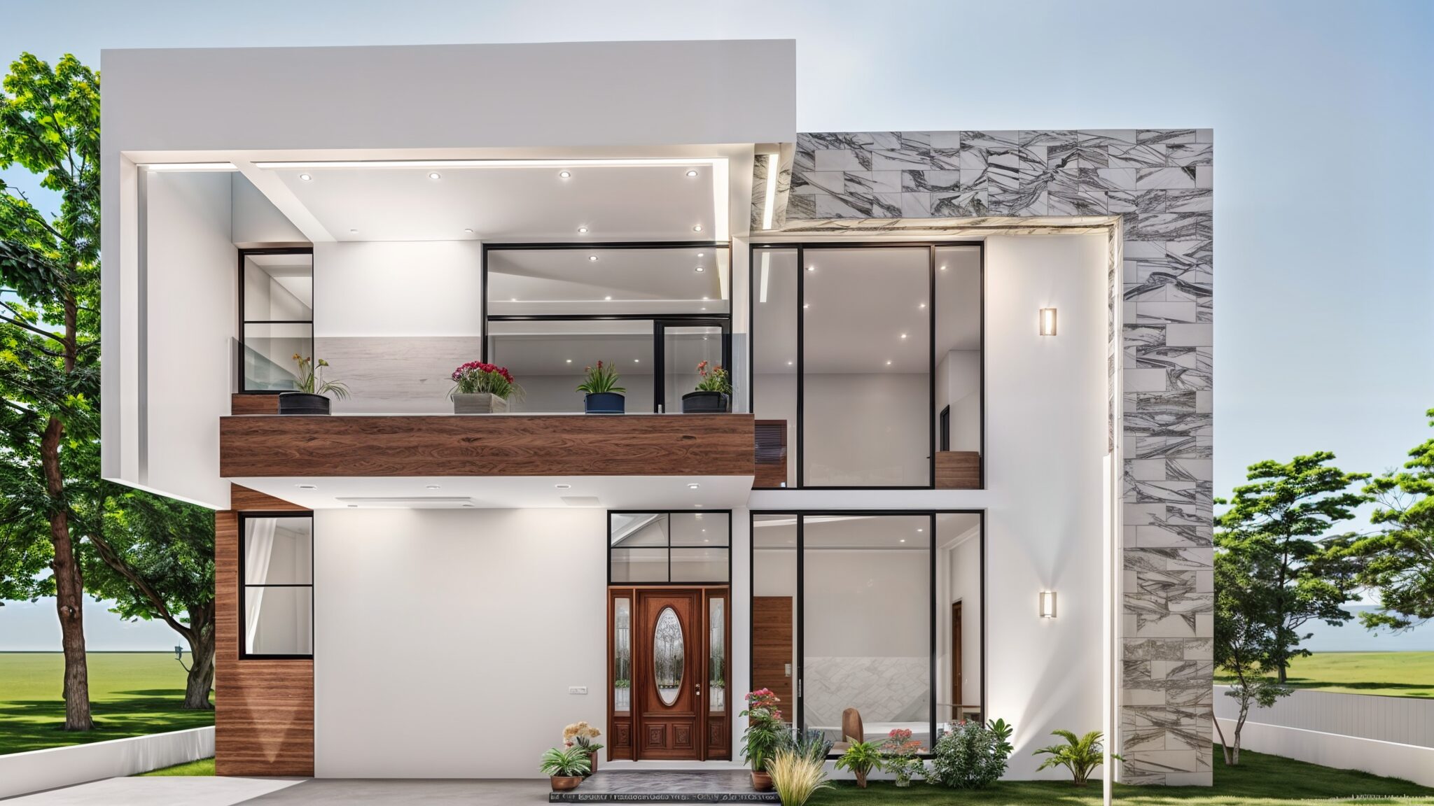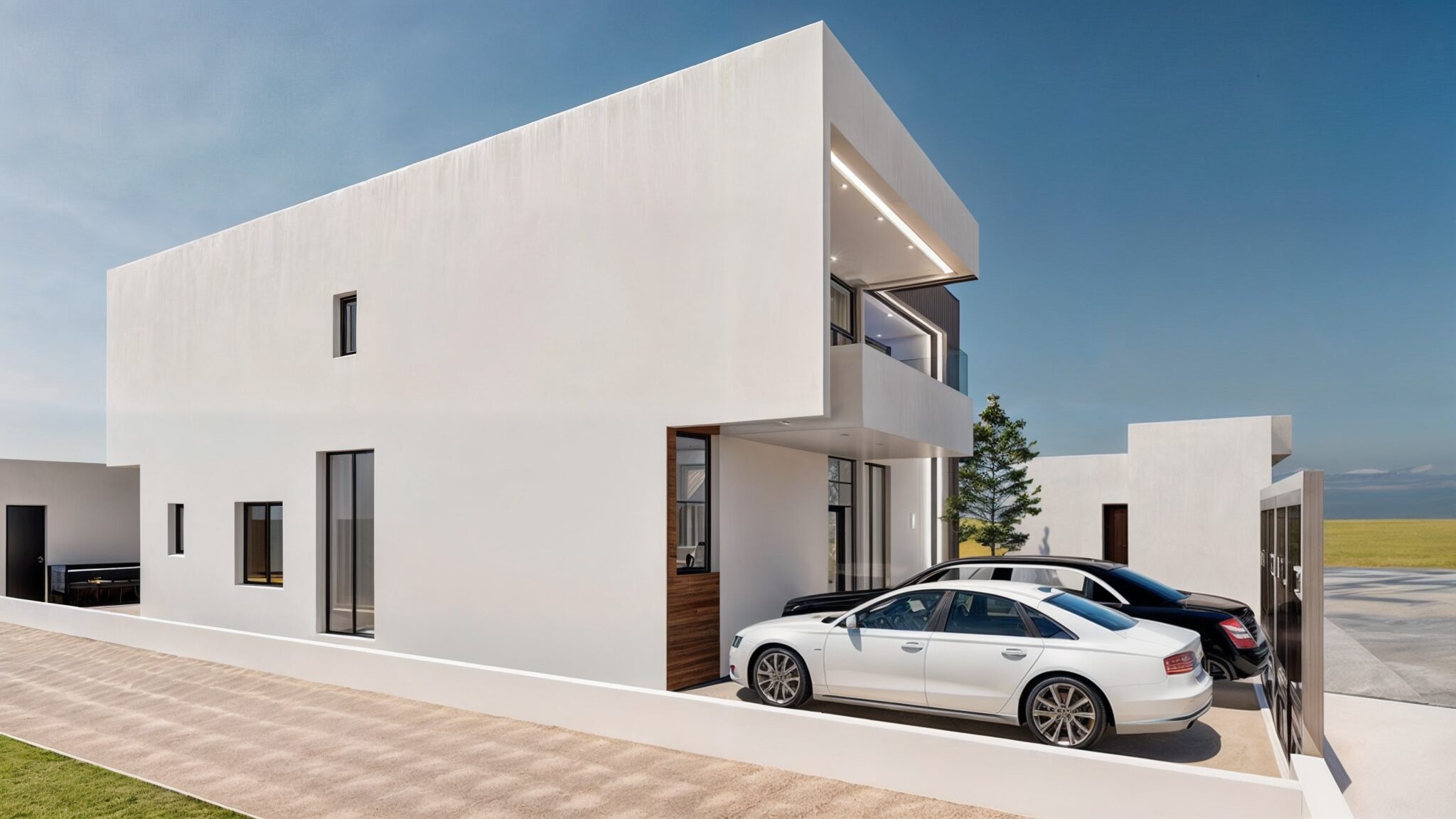 La Villa Duplex AL se distingue par une façade moderne aux lignes nettes, mêlant béton brut, enduits clairs et éléments verticaux décoratifs. L’ensemble crée une identité architecturale forte, sobre et intemporelle.